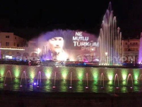 Bu tür perdelerimiz 6 mt. X 12 mt ebatlarından başlayarak hava şartlarına Göre 10mt x 20mt. Ebatlarına kadar ulaşabilmektedir. Oluşturulacak su ekranları üzerinde etkinliğin kapasitesine Ve kullanılacak ekranın ölçülerine göre yüksek Ansı Lümenli Projeksiyon Cihazları, PIGI, Slayt Gösterimleri, Lazer Sistemleri, Multimedia olarak her türlü Show un yapılması mümkündür. Oluşturulacak konsept içinde de Müşterilerimizin talepleri doğrultusunda Ses Sistemi, Işık Sistemi, Müzik Sistemleri, Pirotek ( Ateş Efektleri, Yağmur, Patlayıcılar) ve Havai Fişek efektleriyle organizasyonunuz çok daha zenginleştirilebilir.
